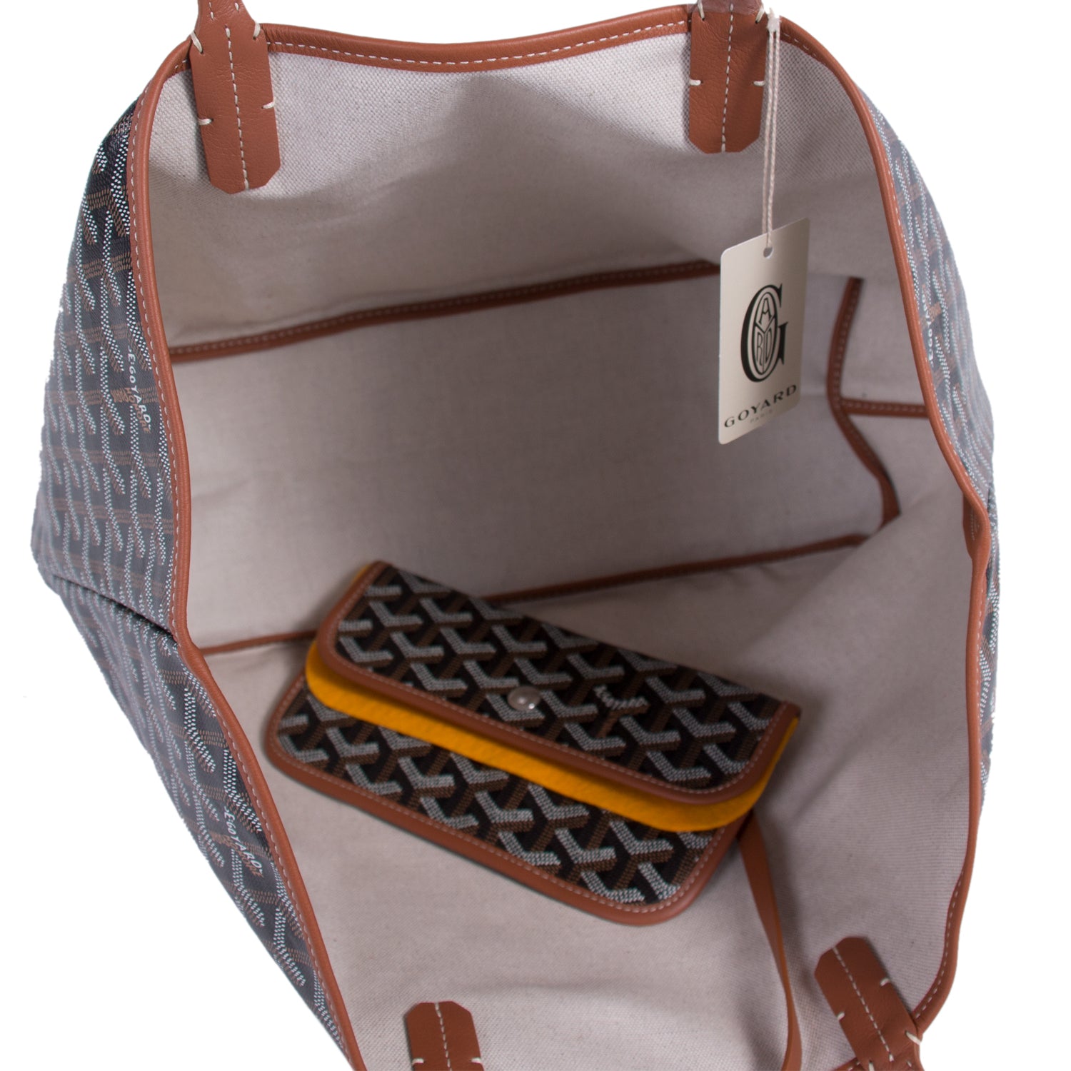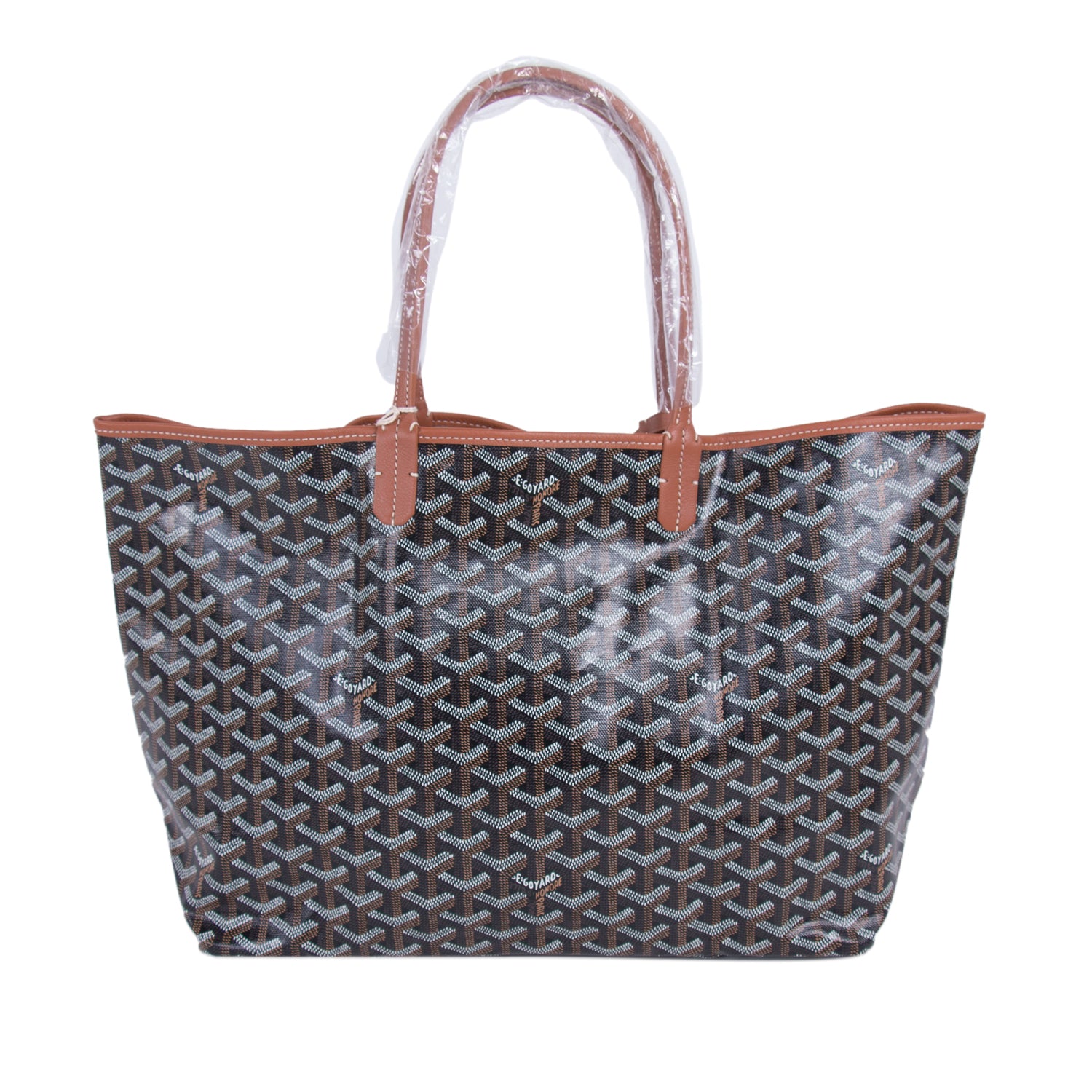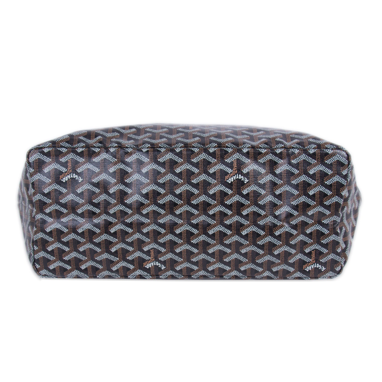 Details: Black, Brown and White Goyardine Coated Canvas / Brown Leather Trim / Dual Rolled Handles / Single Compartment / Natural Fabric Lining / Detachable Pocket / Open Top
