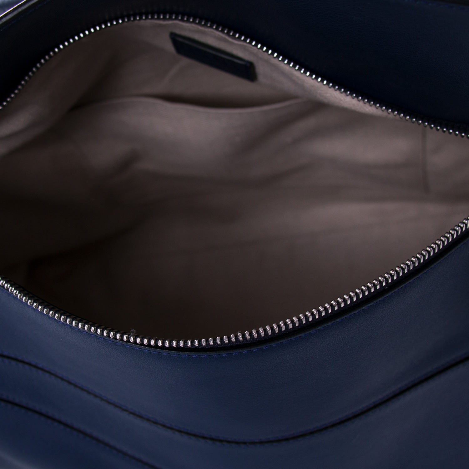 Details: Navy Blue Leather / Silver-Tone Hardware / Single Flat Handle / Detachable Shoulder Strap / Exterior Zip Pocket at Back / Black Leather Trim Throughout / Beige Fabric Interior Lining / Dual Flat Pockets at Inside / Zipper Closure at Top with Small Flap